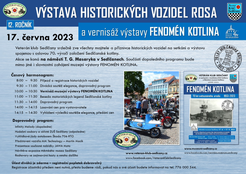 Veterán klub Sedlčany si dovoluje co nejsrdečněji pozvat všechny majitele a příznivce historických vozidel na 12. ročník výstavy historických vozidel Rosa který se koná 17.6. 2023 na náměstí T. G. Masaryka v Sedlčanech.